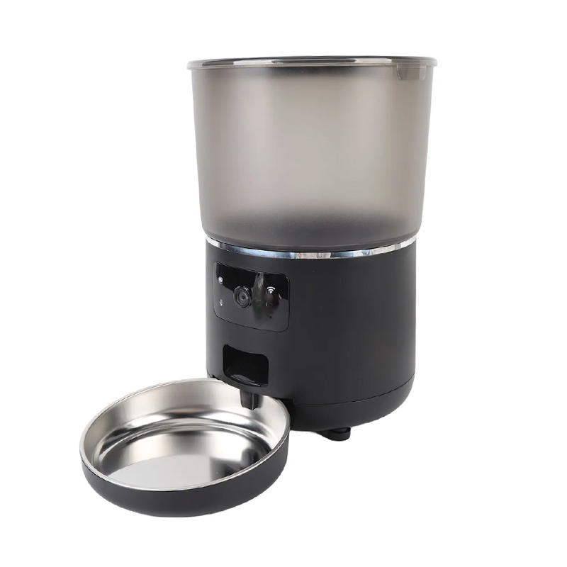 Comedero con Cámara 4L Negro, programable desde el celular, con cámara en tiempo real y plato de acero inoxidable.